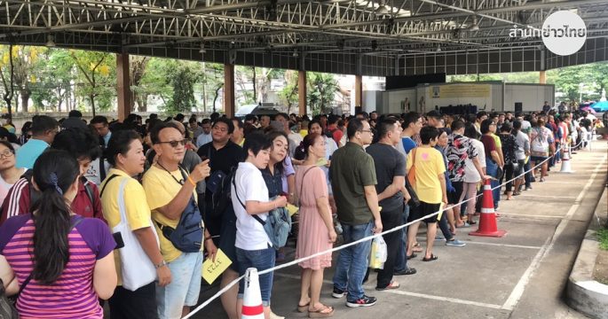 ประชาชนเนืองแน่นร่วมซื้อ เข็มที่ระลึก-เสื้อโปโลสีเหลือง ตราสัญลักษณ์พระราชพิธีบรมราชาภิเษก ที่กรมประชาสัมพันธ์ รายแรกมารอรับบัตรคิวตั้งแต่ 2 ทุ่มวานนี้