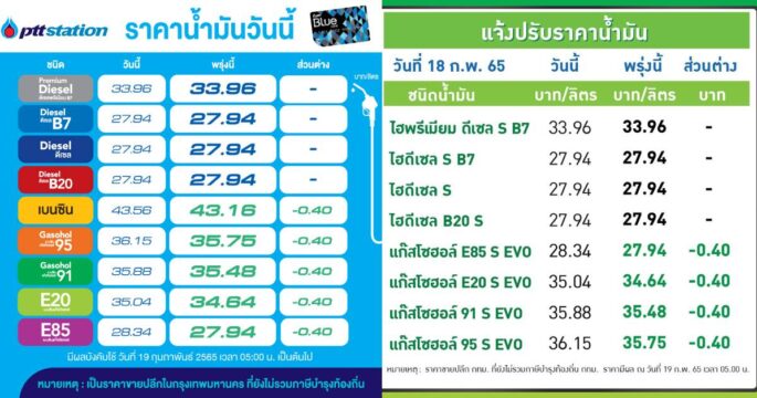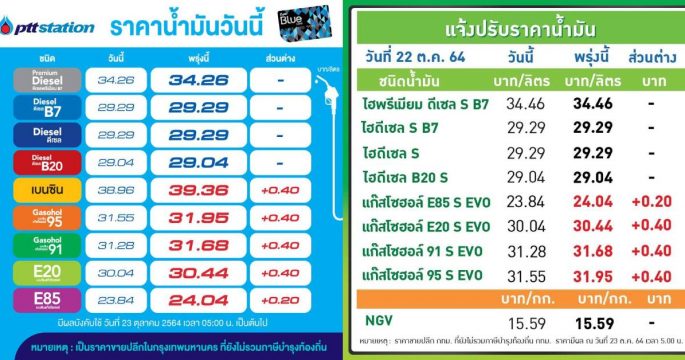 PTT Station ปรับขึ้นราคาน้ำมันทุกชนิด 30-50 สตางค์/ลิตร มีผลวันที่ 24 ธ.ค.64 ตั้งแต่เวลา 05.00 น. เป็นต้นไป