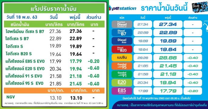 ปตท. ปรับลดราคาขายปลีกน้ำมันกลุ่มเบนซินและแก๊สโซฮอล์ทุกชนิดลง 40 สตางค์ต่อลิตร เว้น E85 ลดลง 20 สตางค์ต่อลิตร ส่วนกลุ่มดีเซล คงเดิม มีผลวันที่ 19 พ.ย.2563 เวลา 05.00 น. เป็นต้นไป