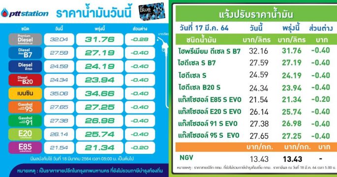 ปตท. บางจาก ปรับลดราคาขายปลีกน้ำมันกลุ่มเบนซินและแก๊สโซฮอล์ทุกชนิดลง 40 สตางค์ต่อลิตร เว้น E85 ลดลง 20 สตางค์ต่อลิตร ส่วนกลุ่มดีเซล ลดลง 40 สตางค์ต่อลิตร เว้น ดีเซลพรีเมี่ยม ลดลง 28 สตางค์ต่อลิตร มีผล 18 มี.ค.64 เวลา 05.00 น. เป็นต้นไป