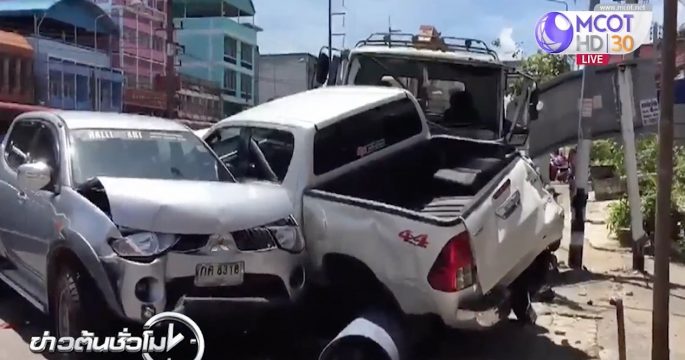 รถบรรทุกเครื่องจักรกวาดถนน เบรกแตกพุ่งชนรถที่กำลังติดไฟแดงอยู่ที่บริเวณสี่แยกตลาดเก่า ตำบลกระบี่ใหญ่ อำเภอเมืองกระบี่ เสียหายไป 9 คัน