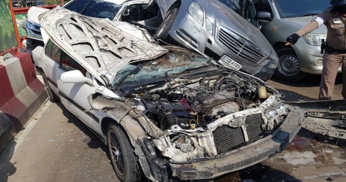 หวาดเสียว!!รถบรรทุก10ล้อเบรคแตกพุ่งชนรถคิดไฟแดงแยกมิสทีนพังยับ8คันเจ็บ3ราย