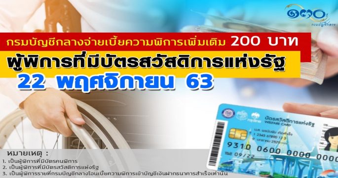 กรมบัญชีกลางพร้อมจ่ายเบี้ยความพิการเพิ่มเติม 200 บาท เข้าบัตรสวัสดิการแห่งรัฐของคนพิการ 22 พ.ย.นี้