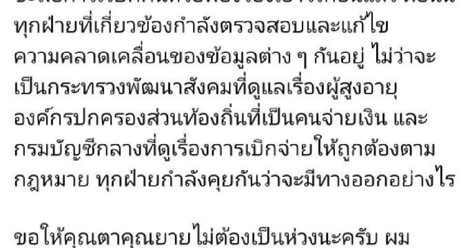 นายกฯ ขอผู้สูงอายุไม่ต้องกังวลหาเงินมาคืนเบี้ยยังชีพผู้สูงอายุ สั่งชะลอฟ้องร้อง จนกว่าจะตรวจสอบกฎหมายเสร็จ