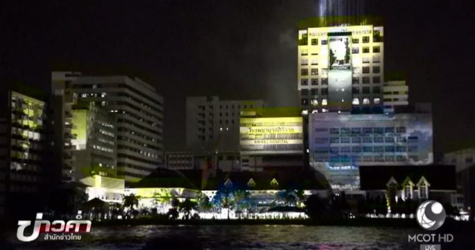 ประชาชนร่วมชมแสงสีสื่อผสมฉายพระบรมฉายาลักษณ์บนอาคาร รพ.ศิริราช