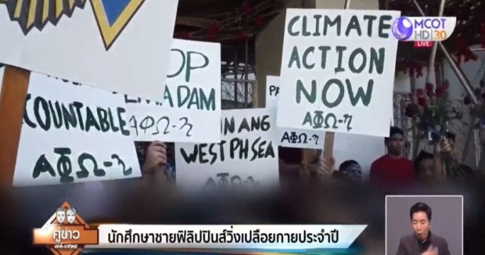 นักศึกษาชายมหาวิทยาลัยในฟิลิปปินส์ร่วมกันวิ่งเปลือยกายประจำปีภายในมหาวิทยาลัย เพื่อกระตุ้นให้ตระหนักถึงปัญหาการเปลี่ยนแปลงสภาพอากาศ