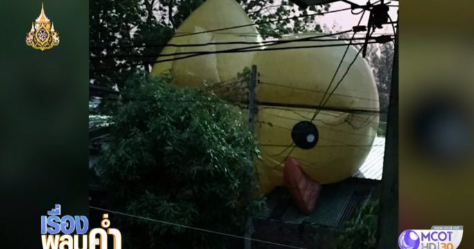 พายุฤดูร้อนพัดถล่มอุดรธานีเมื่อเย็นวานนี้ ทำให้ “เป็ดเหลืองหนองประจักษ์” ถูกแรงลมพัดพาขึ้นสู่ท้องฟ้า ก่อนตกลงบริเวณร้านนวด ฝั่งตรงข้ามหนองประจักษ์