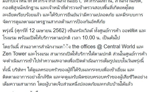 เซ็นทรัลเวิลด์พร้อมเปิดให้บริการพรุ่งนี้ หลังวิศวกรตรวจสอบยืนยันความปลอดภัย