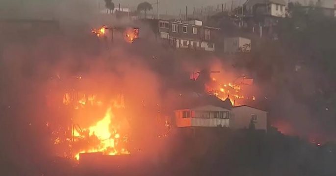 ไฟป่าเผาผลาญย่านชานเมืองของเมืองบัลปาราอิโซ เมืองชายฝั่งทางตะวันตกเฉียงเหนือของกรุงซันติอาโกของชิลีในช่วงคืนก่อนคริสต์มาส เผาทำลายบ้านเรือนไปกว่าร้อยหลัง