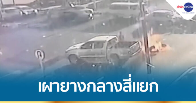วุ่นทั้งเมือง วงจรปิดเผยภาพ มือดีขับรถกระบะ 4 ประตู มาจอดกลางสี่แยกไฟแดงกลางเมืองอำนาจเจริญ จากนั้นนำยางรถยนต์ลงมาวาง แล้วราดน้ำมันจุดไฟเผา ทำรถติดยาว
