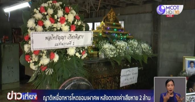 เผาบ่ายวันนี้ศพเหยื่อทหารโหด หลังเจรจาเงินเยียวยาลงตัว แม่ผู้ตายเผยคู่กรณียอมรับเงื่อนไข แต่ขอลดเงินเยียวยาจาก 5 ล้านบาท เหลือ 2 ล้านบาท ส่วนน้องชายที่บาดเจ็บสาหัสยังรักษาตัวอยู่ที่โรงพยาบาล
