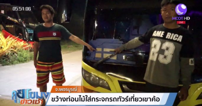 เกิดเหตุรถทัวร์นักท่องเที่ยวถูกคนขว้างท่อนไม้ใส่จนกระจกแตกเสียหาย บนถนนสายสระบุรี-หล่มสัก อ.บึงสามพัน จ.เพชรบูรณ์ ตำรวจคาดฝีมือวัยรุ่นคึกคะนอง