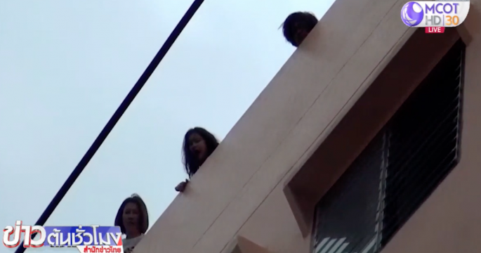 กู้ภัยเร่งช่วยเด็กๆ ที่หนีเหตุเพลิงไหม้ร้านก๋วยเตี๋ยวริมถนนพระยาสัจจา อำเภอเมืองชลบุรี ขึ้นไปอยู่บนชั้นดาดฟ้า