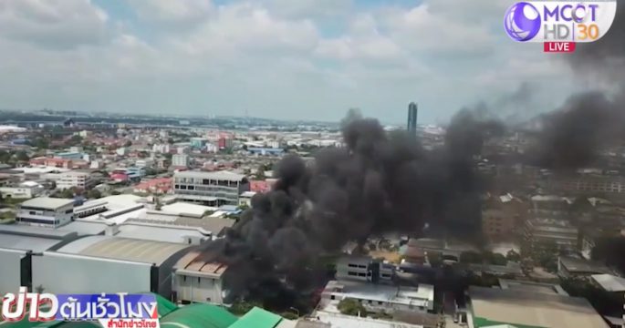 เกิดเหตุเพลิงไหม้โรงงานผลิตขวดน้ำพลาสติก ภายในซอยท่านผู้หญิง ถนนเทพารักษ์ เจ้าหน้าที่ดับเพลิงระดมรถน้ำกว่า 10 คันฉีดสกัด