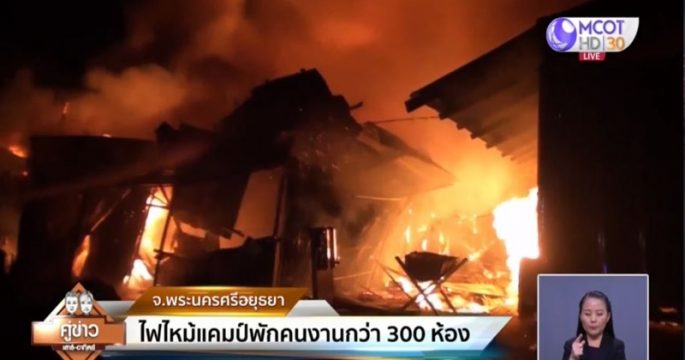 เกิดเพลิงไหม้เพิงพักคนงานในจังหวัดพระนครศรีอยุธยา เพิงพักกว่า 300 ห้อง ถูกไฟเผาเสียหายทั้งหมด บาดเจ็บ 1 คน สาเหตุคาดไฟฟ้าลัดวงจร