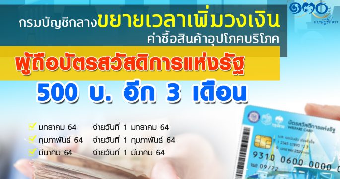 ผู้ถือบัตรสวัสดิการแห่งรัฐ เฮ!! กรมบัญชีกลางเพิ่มวงเงิน 500 บาท ต่อเนื่อง 3 เดือน (ม.ค.-มี.ค.64) เพื่อช่วยเหลือค่าใช้จ่ายสินค้าอุปโภคบริโภคให้แก่ผู้มีรายได้น้อย