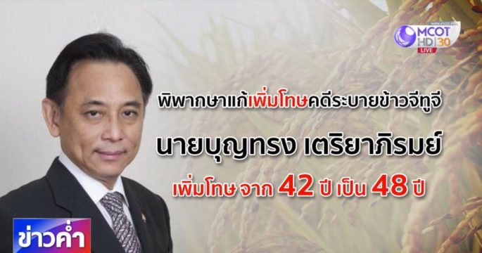 อุทธรณ์คดีระบายข้าวจีทูจี พิพากษาแก้เพิ่มโทษจำคุก “บุญทรง” อีก 6 ปี รวมจำคุก 48 ปี ขณะที่กลุ่มโรงสีเจอโทษให้จำคุก-ปรับ 6 ราย แต่รอลงอาญา 3 ปี จากเดิมให้ยกฟ้อง ด้านลูก “บุญทรง” เผยพ่อช็อก หลังฟังคำพิพากษา แต่ต้องยอมรับ