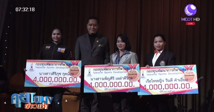 3 อดีตจอมพลังสาวทีมชาติไทย รับเงินรางวัลอัดฉีดย้อนหลังเกือบคนละ 6 ล้านบาท จากการขยับขึ้นไปคว้าเหรียญทองแดงโอลิมปิกเกมส์ปักกิ่งเกมส์ และลอนดอนเกมส์
