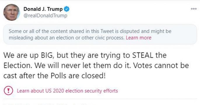 ทวิตเตอร์และเฟซบุ๊ก สองบริษัทโซเชียลมีเดียยักษ์ใหญ่ของโลกขึ้นคำเตือนในข้อความแสดงความเห็นของประธานาธิบดีโดนัลด์ ทรัมป์ ของสหรัฐต่อการเลือกตั้งที่ผลการนับคะแนนยังไม่สิ้นสุด