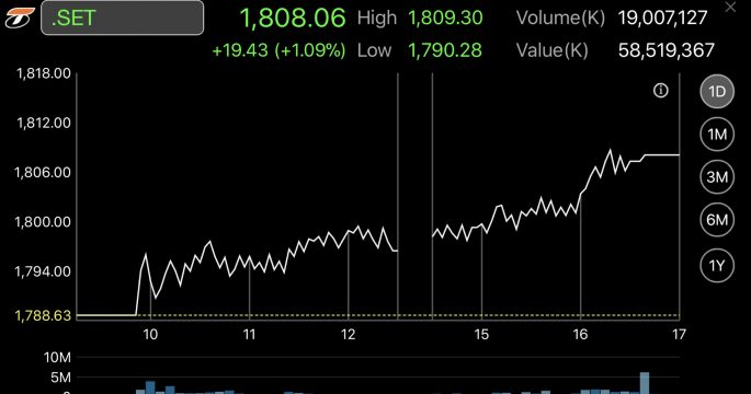 หุ้นไทยบวกแรงเกือบ 20 จุด ยืนเหนือ 1,800 จุด ตามตลาดต่างประเทศ