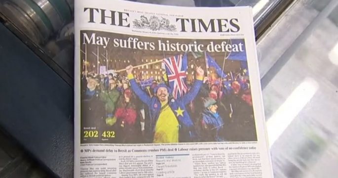 พาดหัวข่าวหนังสือพิมพ์อังกฤษฉบับวันนี้พากันใช้คำว่า “ยับเยิน” และ “อับอาย” กับ นายกรัฐมนตรีเทเรซา เมย์ที่พ่ายการลงมติข้อตกลงเบร็กซิทในสภาเมื่อค่ำวานนี้