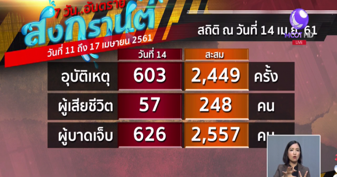 สรุปอุบัติเหตุ 4 วัน บาดเจ็บ 2,557 คน เสียชีวิต 248 ราย กำชับด่านชุมชนกวดขันรถจักรยานยนต์ ดื่มแล้วขับ ขับเร็ว เตรียมปรับแผนรองรับการเดินทางกลับ