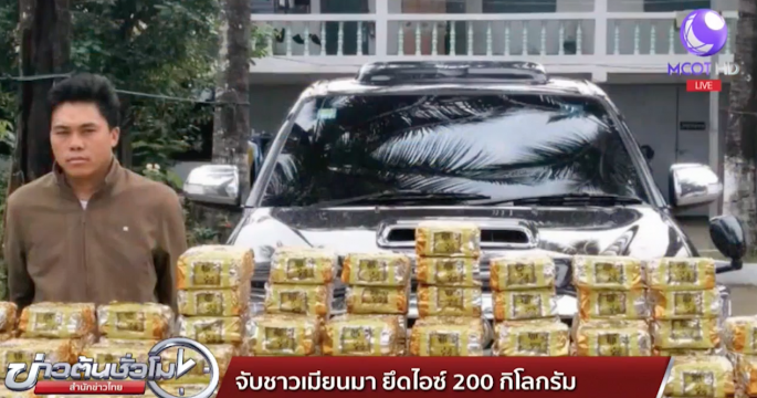 นายอ้าจา ชาวเมียนมา ถูกตำรวจปราบปรามยาเสพติดเมียนมาจับกุมได้ ขณะขับรถกระบะบรรทุกยาไอซ์ 200 กิโลกรัมมาเต็มคันรถ บนถนนสายเชียงตุง-ท่าขี้เหล็ก