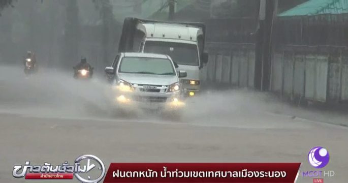 ฝนตกหนักต่อเนื่องในเขตเทศบาลเมืองระนอง ทำให้เกิดภาวะน้ำท่วมขังรอการระบายลงสู่คลองสายต่างๆ บางจุดสูง 10-15 ซม. รถเล็กสัญจรลำบาก