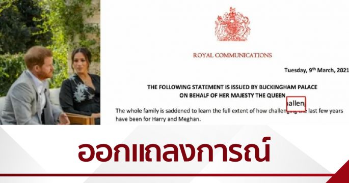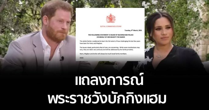 สำนักพระราชวังบักกิงแฮม ออกแถลงการณ์ สั้นๆ ด้วยเนื้อความเพียง 61 คำ ต่อกรณีการให้สัมภาษณ์ของเจ้าชายแฮร์รีกับเมแกน ดยุกและดัชเชสแห่งซัสเซกส์ ที่พาดพิงถึงราชวงศ์