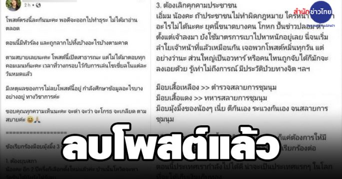 ผู้พันเจี๊ยบ รองโฆษกกองทัพบก ลบโพสต์แล้ว หลังอัด 3 ข้อเรียกร้อง กลุ่มเยาวชนปลดแอกแค่ม็อบมุ้งมิ้ง ชี้ประเทศกำลังไปได้ดี แนะเอาเวลาไปทำมาหากินดีกว่า เชื่อมีคนอยู่เบื้องหลังให้เกิดม็อบเรียกร้องต่อเนื่อง