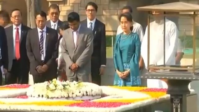 นางออง ซาน ซู จี ที่ปรึกษาแห่งรัฐเมียนมาร์เดินทางถึงกรุงนิวเดลีของอินเดียแล้ววันนี้ และเดินทางต่อไปยังราชฆาฏ หรืออนุสรณ์สถานมหาตมะ คานธี