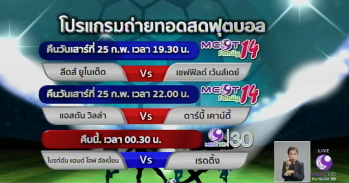 โปรแกรมแข่ง EFL คืนนี้ 9MCOT HD และ MCOT Family ถ่ายทอดสด