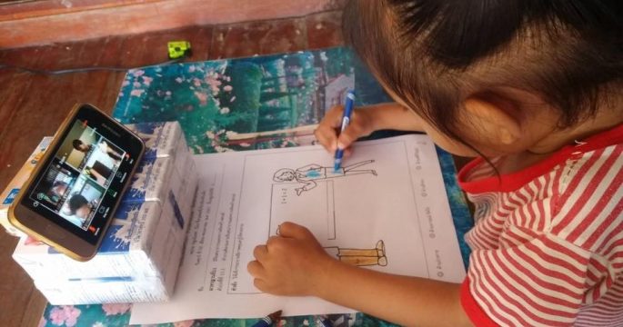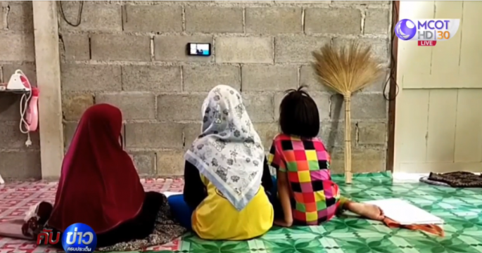 เด็ก 3 คน ในหมู่บ้านลิกี ต.เกาะกลาง อ.เกาะลันตา จ.กระบี่ รวมตัวกันนั่งเรียนออนไลน์ จากหน้าจอมือถือแปะที่ฝาผนังด้วยกาวสองหน้า ขณะที่คุณครูไปเยี่ยมเห็นแล้วสงสารช่วยติวให้