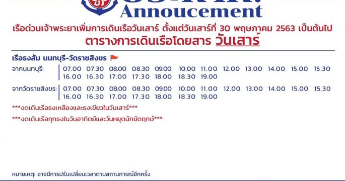 ผลกระทบโควิด-19 “เรือด่วนเจ้าพระยา” ผู้โดยสารหด 90% ต่ำสุดในรอบ 50 ปี ประกาศงดให้บริการเดินเรือในวันหยุดเสาร์-อาทิตย์ รวมถึงวันนักขัตฤกษ์ เริ่มตั้งแต่วันที่ 8 พ.ค.