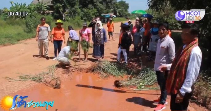 ช่วง “เรื่องนี้มีคำถาม” ชาวบ้านประชดนำต้นไม้และต้นหญ้าข้างทาง วางในหลุมบ่อถนนสายบ้านโนนทัน-บ้านโนนกกบาก ใน จ.อุดรธานี ถนนสายเศรษฐกิจของชาวบ้าน แต่พังเป็นหลุมเป็นบ่อลึกมานานหลายปี จนรายได้หด ทั้งร้านอาหารและร้านขายของไม่มีคนผ่านมาซื้อของ