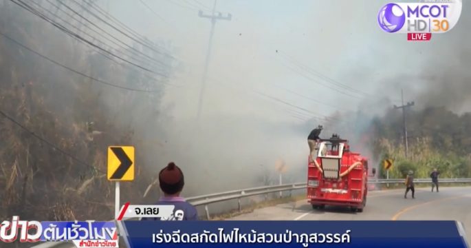 มีเหตุไฟไหม้สวนป่าภูสวรรค์ ป่าไม้สักที่อยู่ริมถนนสายเลย-ภูเรือ อำเภอเมือง จ.เลย ชาวบ้านและเจ้าหน้าที่ ต้องเร่งนำรถดับเพลิง เข้าช่วยฉีดสกัดไม่ให้ไฟลุกลามไหม้สายไฟฟ้าแรงสูง