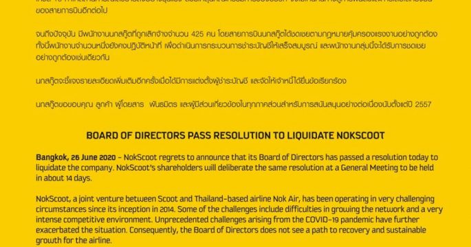 ผู้สื่อข่าวรายงานว่าในวันนี้ (26 มิ.ย.) สายการบินนกสกู๊ต ออกประกาศว่า คณะกรรมการของบริษัทฯ ได้มีมติเลิกกิจการ
