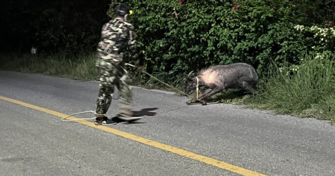 เจ้าหน้าที่เร่งช่วยเหลือเลียงผานอนอยู่บนถนนตัดใหม่ ต.บางลึก อ.เมือง จ.ชุมพร คาดฟื้นตัวจากยาสลบ ตกใจกระโดดออกจากรถที่ลักลอบขนย้าย