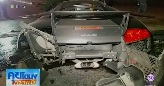 หนุ่มซิ่งรถหรูลัมโบร์กีนีเฉี่ยวชนรถจักรยานยนต์ และเสียหลักชนต้นไม้ ถนนเลียบด่วนรามอินทรา บาดเจ็บ 4 ราย รถหรูพังยับเยิน ขณะที่คนขับไม่เป็นอะไร
