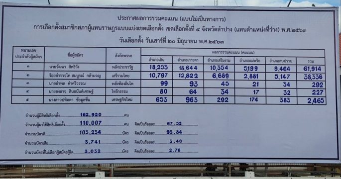 กกต.ลำปางประกาศผลคะแนนเลือกตั้งซ่อมเขต 4 อย่างไม่เป็นทางการ