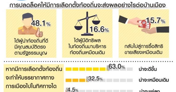 ประชาชนร้อยละ 63 เห็นว่าหากปลดล็อคให้มีการเลือกตั้งระดับท้องถิ่น บรรยากาศทางการเมืองน่าจะดีขึ้น