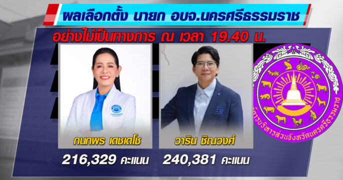 ลุ้นผลคะแนนเลือกตั้งนายก อบจ.นครศรีธรรมราช นับเสร็จแล้วบางหน่วย ล่าสุด ณ เวลา 19.40 น. “วาริน ชิณวงศ์” เบอร์ 2 จากทีมนครเข้มแข็ง ชนะคู่แข่งขาดลอยในหลายหน่วย คะแนนทิ้งห่างแชมป์เก่า “กนกพร เดชเดโช” เบอร์ 1 จากพรรค ปชป.