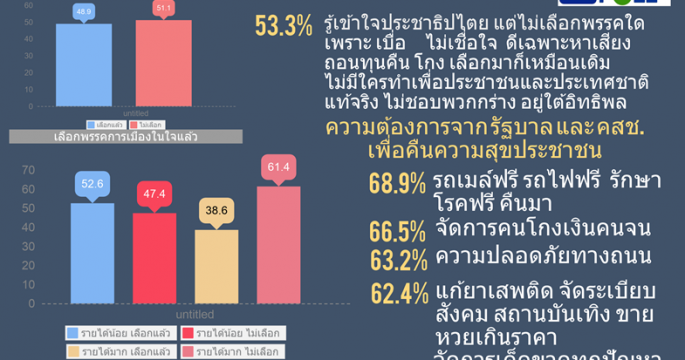 ซูเปอร์โพลเผยเสียงประชาชนที่เลือกพรรคในใจกับเบื่อพรรคการเมืองก่ำกึ่งกัน พร้อมอยากให้รัฐบาลคืนความสุขรถเมล์ รถไฟ และรักษาโรคฟรี