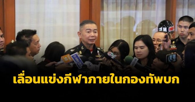 ผบ.ทบ.สั่งเลื่อนแข่งกีฬาภายในกองทัพบกปี 63 ไม่มีกำหนด จนกว่าสถานการณ์โควิด-19 คลี่คลาย ขณะที่ศูนย์อำนวยการป้องกันและแก้ไขปัญหาโลกโควิด-19 ทบ.ออกมาตรการดูแลทหารเกณฑ์ทั่วประเทศ