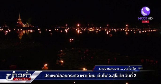 บรรยากาศของงานประเพณีลอยกระทง เผาเทียน เล่นไฟ ที่อุทยานประวัติศาสตร์สุโขทัย คืนนี้เนืองแน่นไปด้วยนักท่องเที่ยวที่มาลอยกระทงตามประเพณี และร่วมชมพิธีอัญเชิญพระประทีปพระราชทานลงลอยเป็นปฐมฤกษ์ในเวลา 23.00 น.