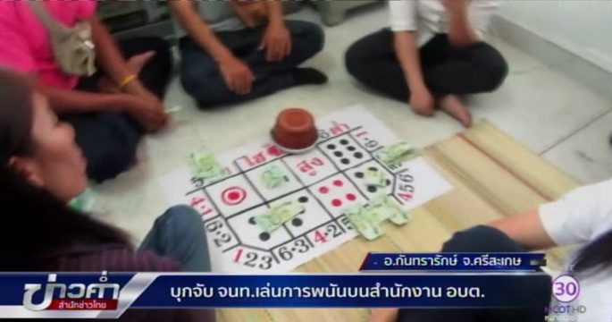 ทหาร ฝ่ายปกครอง ตำรวจ บุกรวบเจ้าหน้าที่ตั้งวงเล่นโฮโลในห้องทำงาน สำนักงาน อบต.ยาง อ.กันทรารมย์ จ.ศรีสะเกษ พบมีผู้อำนวยการคลังร่วมเล่นพนันด้วย
