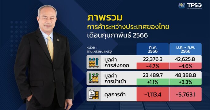 นนทบุรี 30 มี.ค.-พาณิชย์เผยยอดตัวเลขส่งออกเดือนก.พ.66 ยังหดตัวที่ 4.7 % ติดลบต่อเนื่องเป็นเดือนที่ 5 แต่ยังได้ตั้งเป้าหมายการทำงานเพื่อผลักดันให้การส่งออกของไทยในปีนี้ ขยายตัวเป็นบวกที่ 1-2% แม้หลายหน่วยงานมองส่งออกไทยปีนี้ชะลอตัวตามเศรษฐกิจโลกแต่ภาครัฐจะร่วมมือภาคส่งออกเร่งขยายตลาดใหม่ๆให้มากขึ้นไดเต่อไป