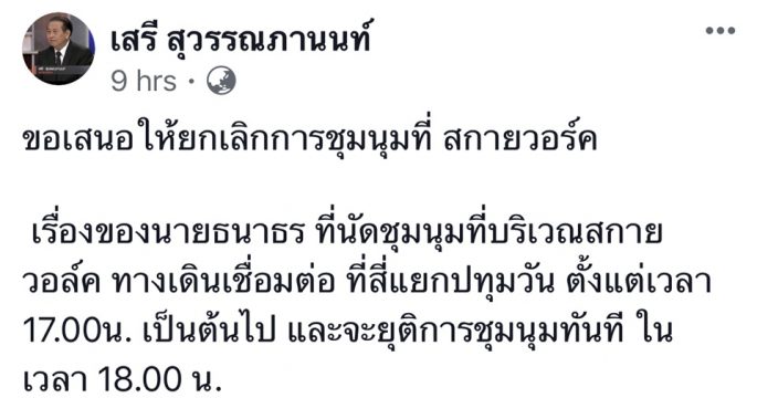 “เสรี” แนะ “ธนาธร” ยกเลิกกิจกรรมปลุกประชาชนออกมาปกป้องพรรคอนาคตใหม่ ที่นัดชุมนุมกันที่สกายวอล์ค วันนี้ (14 ธ.ค.) เตือนผิด พ.ร.บ.ชุมนุม