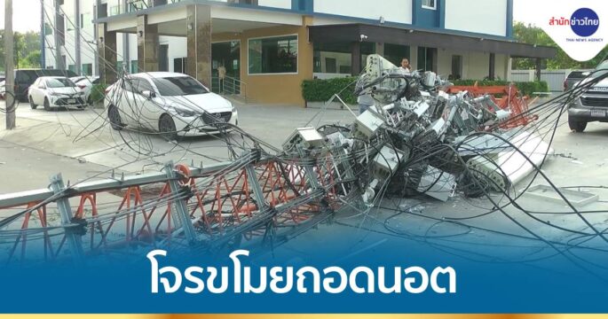 โจรถอดนอตยึดสายสลิง เสาส่งสัญญาณโทรศัพท์มือถือสูงกว่า 30 เมตร พังโค่นลงมากองกับพื้นลานจอดรถโรงแรม รถเสียหาย 5 คัน แต่ไม่มีผู้บาดเจ็บและเสียชีวิต ค่าเสียหายนับล้านบาท
