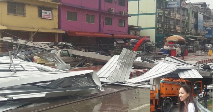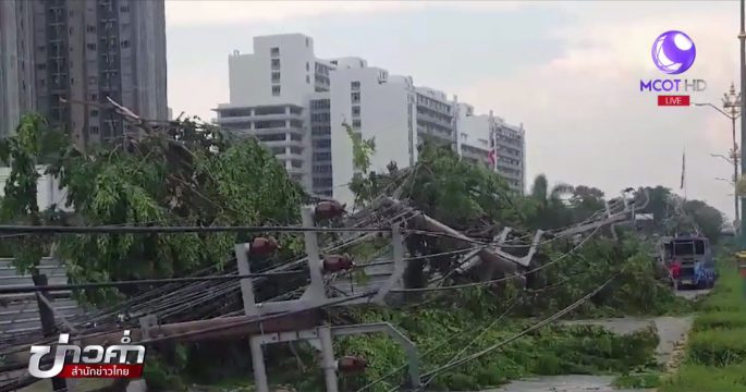 พายุลมแรงพัดเสาไฟฟ้าล้ม 12 ต้น ย่านสนามบินน้ำ กระทรวงพาณิชย์ ทำให้ต้องปิดการจราจรบริเวณหน้าวัดแคนอกถึงกระทรวงพาณิชย์ตลอดเส้น